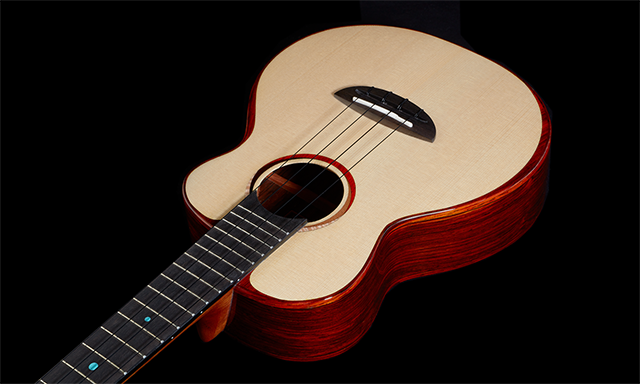 与 Tobias 合作的第二把客制琴,原型琴为UT200。设计上将原本的印度玫瑰木背侧板改为可可波罗木,蓝色绿松石镶嵌的大小点指板点。花圈延续前一把客制琴的设计,简单的线条以虎纹枫木、相思木、玫瑰木与可可波罗木做镶嵌,鲜红的可可波罗木衬托也协调了奶油黄的月亮云杉。